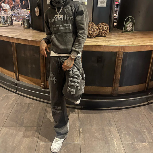 Retro Street Style Printed Hoodie Set
