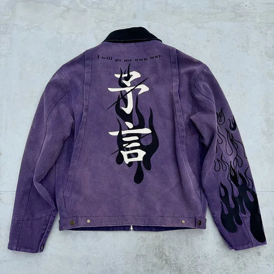 Japanese Flame Printed Long Sleeve Zipper Pocket Jacket
